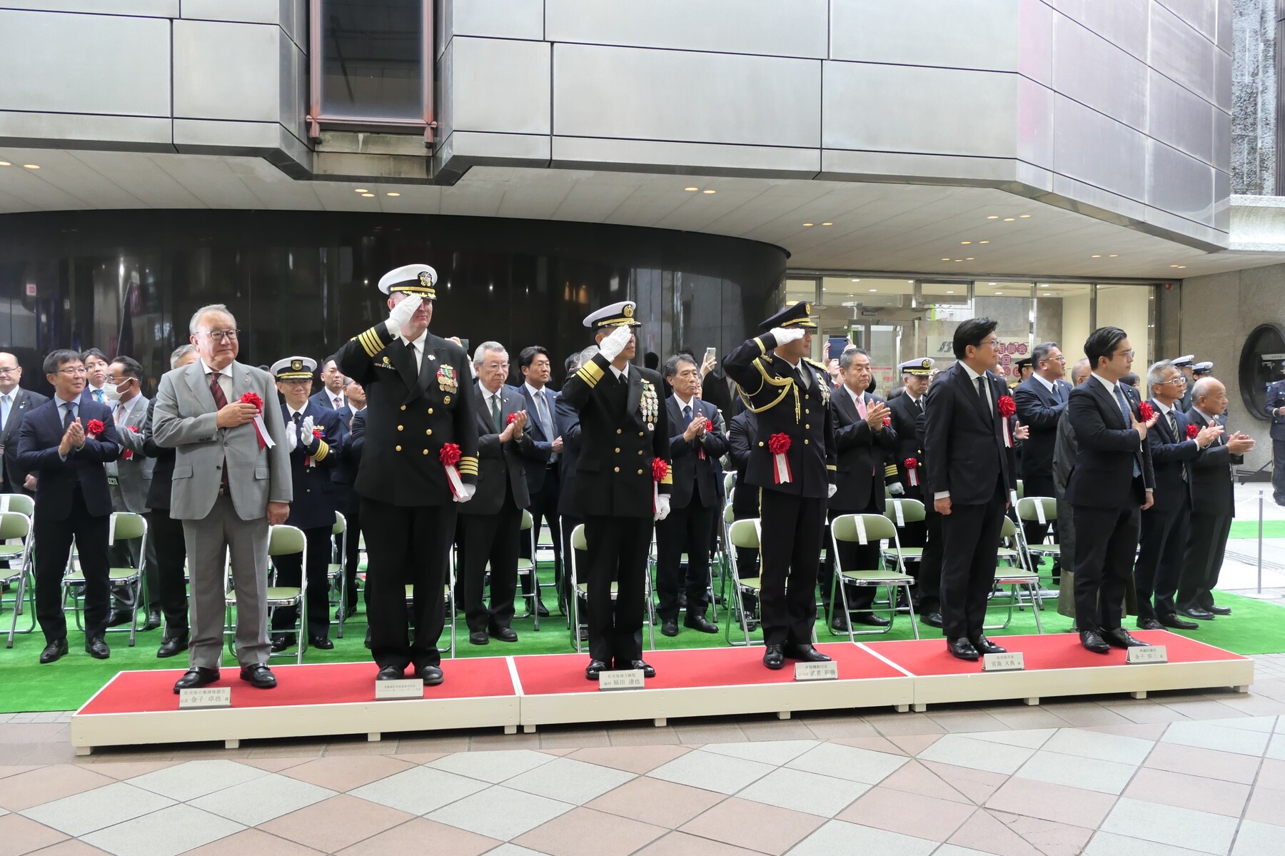 当後援会青年部では日米国旗の小旗を市民に配布し、隊員を応援しました。