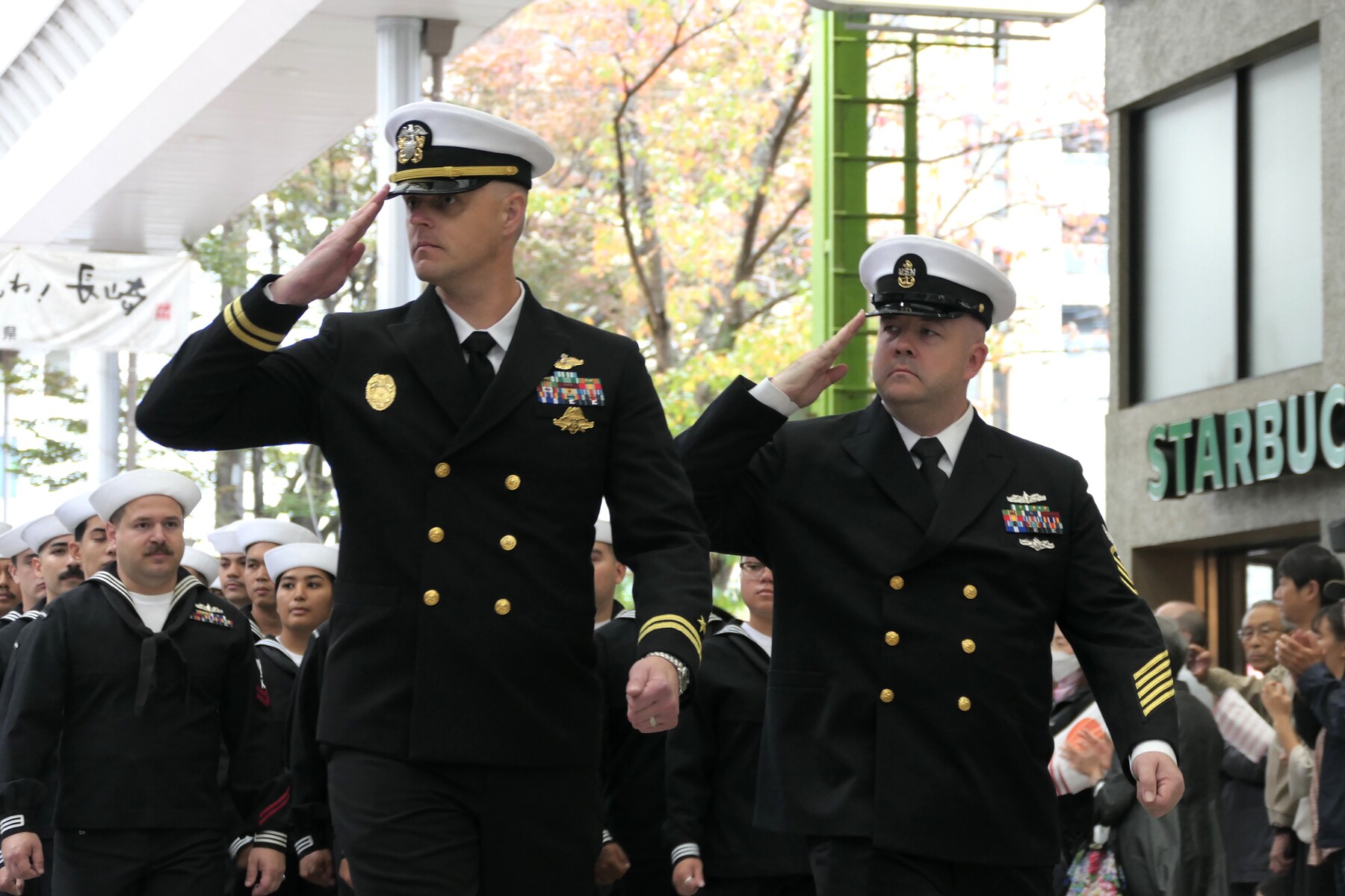 海上自衛隊・陸上自衛隊・米海軍の3部隊合わせて約300名が力強く行進をしました。