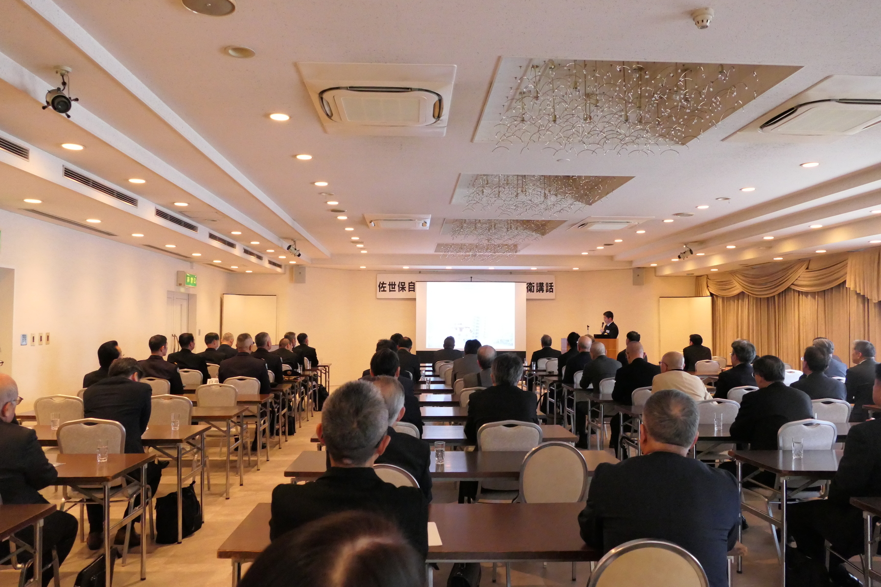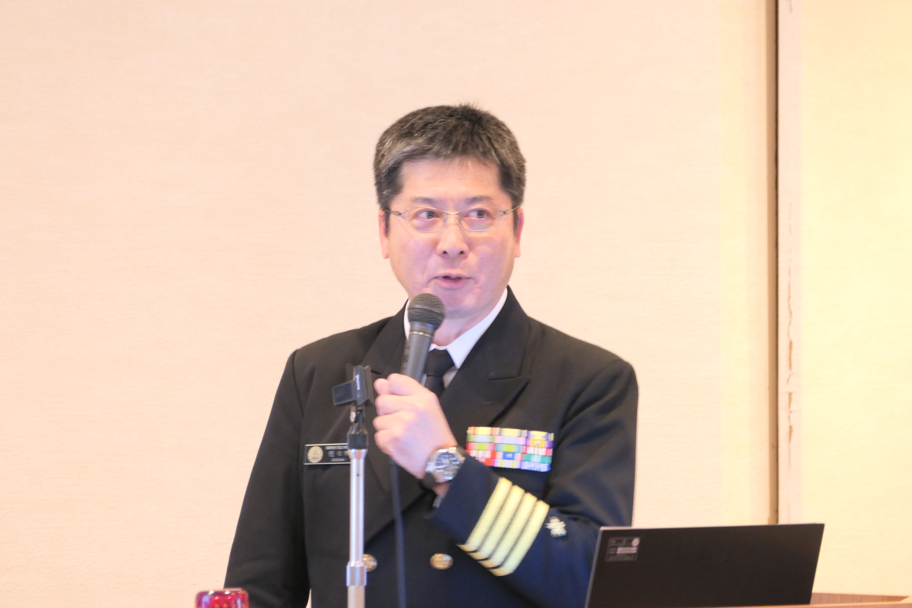 例会では自衛隊長崎地方協力本部長の佐々木昌貴1等海佐をお招きし、